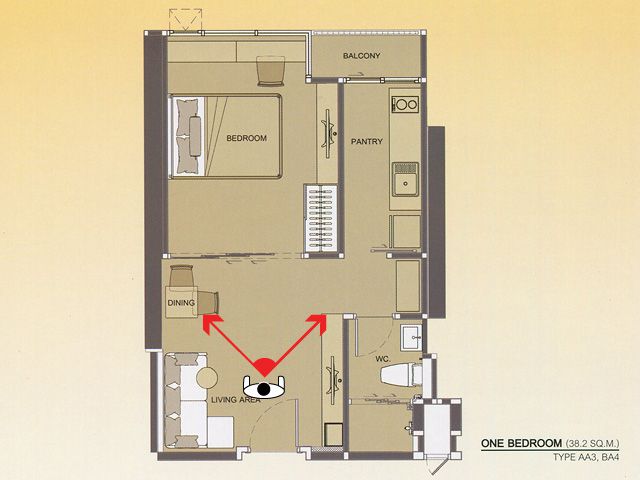 มาเริ่มกันที่ห้อง 1 bedroom กันก่อนครับ ห้อง 1 bedroom โครงการทำมา 2 ขนาด โดยวางห้องนอนและครัวอยู่ด้านนอกทั้งหมด นอกจากขนาดพื้นที่แล้ว สิ่งที่แตกต่างกันคือแบบ 31 ตร.ม.นั้นตำแหน่งห้องครัวกับห้องน้ำนั้นจะอยู่คนละด้านกัน แต่แบบ 38 ตร.ม. จะอยู่ด้านเดียวกัน ซึ่งจากที่ผมเข้าไปดูมาพบว่าเวลาเข้าไปยื่นตรงโถงของทั้ง 2 ห้อง บริเวณ living area (ตำแหน่งตามกราฟฟิกในรูป) แบบ 38 ตร.ม. นั้นให้ความรู้สึกโปร่งกว่าค่อนข้างมาก เพราะมองผ่านไปเจอกระจกใสที่กั้นห้องนอนทั้งหมด ไม่เจอผนังกั้นห้องนอนกับครัวเหมือนในแบบ 31 ตร.ม. ครับ แถมห้องนอนของแบบ 38 ตร.ม. นี้มีขนาดใหญ่กว่าห้องนอนของแบบ “1 plus 1 ที่มีขนาด 45 ตร.ม.” ด้วยซ้ำไปครับ เลยยิ่งทำให้ดูกว้าง