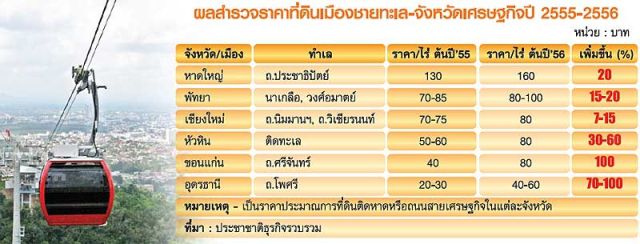 โดย เฉพาะราคาที่ดินเมืองชายทะเลและเมืองเศรษฐกิจ เทียบราคาปีต่อปี (2555-2556) ขยับสูงขึ้น 30-100% ที่ดินหน้าหาดตอนนี้พูดกันถึงตัวเลข 100-120 ล้านบาท ที่น่าตะลึงกว่านั้นคือ “หาดใหญ่” จ.สงขลา บอกขายกันถึงไร่ละ 160 ล้านบาททีเดียว