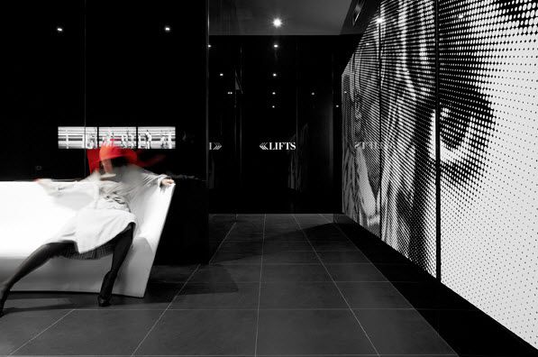 ดูผ่านๆอาจจะนึกว่าเป็นการประหยัดงบก่อสร้าง แต่จริงๆแล้วเป็นความตั้งใจของสถาปนิกที่ต้องการให้เกิดความขัดแย้งกันเอง เวลาเข้าไปในอาคารแล้ว สังเกตได้จากจากสีสันฉูดฉาดด้านนอกพอเข้ามาถึงบริเวณล็อบบี้กลับตกแต่งตัวโทนสีขาว-ดำทั้งหมด