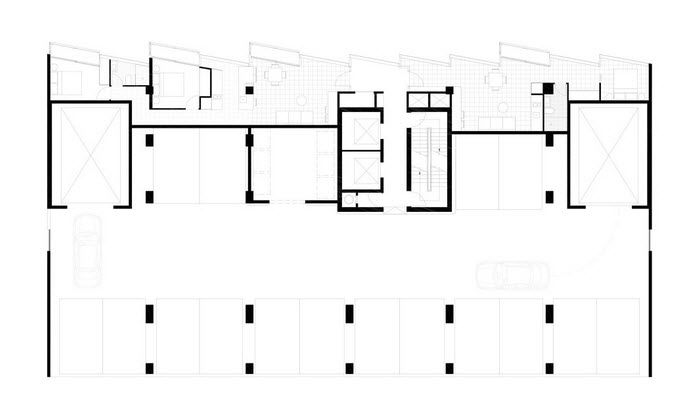 ด้วยความที่ที่ดินเล็กมาก เวลาเอารถขึ้นไปจอดบนอาคารจึงต้องใช้ลิฟต์สำหรับรถยนต์ครับ แต่พอชั้นบนๆที่ไม่มีที่จอดรถแล้ว ก็จะมีห้องทั้ง 2 ด้าน ผนังที่กั้นห้อง living room กับ bedroom นั้นเป็นแบบเลื่อนเก็บได้ เผื่อไว้สำหรับขยายห้อง living กรณีเพื่อนๆมาปาร์ตี้ที่บ้านนั่นเอง