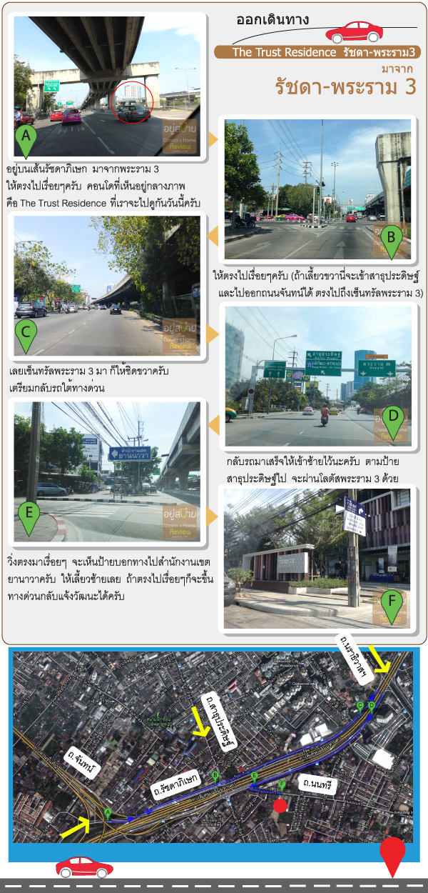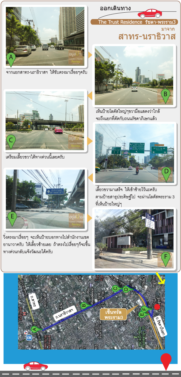 การเดินทางไป The Trust Residence รัชดา พระราม3 นี้ถ้ามาจากในเมืองแถวสาทร ก็ให้ขับรถตรงตามถนนนราธิวาสราชนครินทร์มาเรื่อยๆครับ จนถึงช่วงที่ตัดกับเส้นรัชดาภิเษก ก็ให้เลี้ยวขวามา แล้วก็อยู่เลนทางด้านซ้ายมือไว้ครับ (เพราะขวามือจะขึ้นสะพานเลยไป) จากนั้นตรงมาเรื่อยๆก็จะถึงถนนนนทรีครับ ด้านหน้ามีป้ายสำนักงานเขตยานาวาอยู่ เห็นชัดเจน จากนั้นเลี้ยวเข้าถนนนนทรีมานิดเดียวประมาณ 200 เมตรก็ถึงครับ
