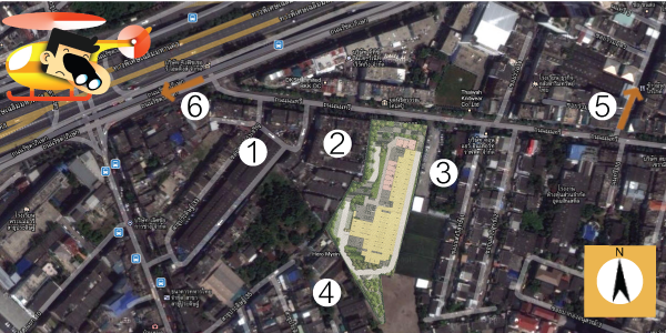 เรามาเริ่มจากหันหน้าเข้าหาโครงการครับ ด้านซ้ายมือจะเป็นสนามฟุตบอลให้หนุ่มๆออกกำลังกาย หรือสาวๆคนไหนจะแอบไปเหล่นักกีฬาก็พอได้อยู่ ด้านทางขวามือเป็นกลุ่มอาคารพาณิชย์ตึกแถวเก่าๆครับ แล้วก็บ้านพักอาศัยทั่วไป ถัดจากตึกแถวไปหน่อยก็เป็นตลาดรุ่งเจริญ อันนี้เป็นตลาดสดครับ วิ่งผ่านเข้าไปในตลาดสามารถทะลุสาธุประดิษฐ์ได้ ส่วนด้านหลังโครงการก็เป็นบ้านพักอาศัยทั่วไปเช่นกัน จุดที่ช่วยส่งเสริมให้ทำเลตรงนี้ให้ดูดีคืือเบอร์ 5 กับ 6 ในรูปด้านล่างครับ