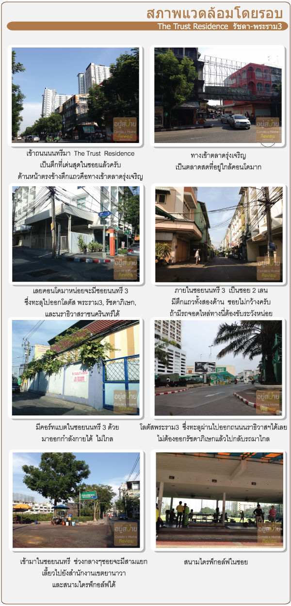 โด The Trust นั้นอยู่ห่างจากปากทางถนนนนทรีแค่ 200 เมตรครับ เวลามองจากถนนรัชดาภิเษกนั้นเห็นตั้งเด่นเป็นสง่าเลย เพราะแถวนี้ไม่ค่อยมีคอนโดแท่งสูงๆเท่าไหร่ พื้นที่รอบๆในโซนนี้เดิมเป็นบ้านคนทั่วไป อาคารพาณิชย์ และโรงงานซะส่วนมาก แต่ก็มีสิ่งอำนวยความสะดวกมากพอดู คอนโดสูงๆในซอยนี้นอกจาก The Trust Residence ที่กำลังรีวิวแล้ว มองเลยไปจากที่ตั้งโครงการจะเห็นรุ่นพี่เก่าแก่อย่าง P.S.T. Condo Ville ซึ่งเป็นของ L.P.N. ครับ แต่ตัวนี้ก็สร้างมานานเป็นสิบปีแล้วแหละ
