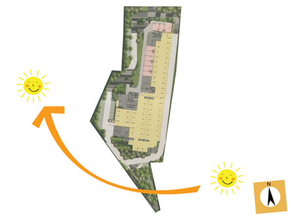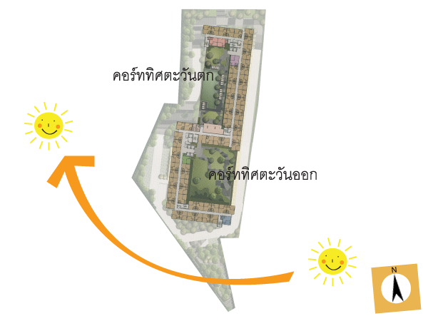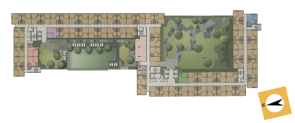 ช่วงระยะห่างของตึกสองฝั่งในแต่ละคอร์ทนั้นคอร์ทตะวันตกที่มีสระว่ายน้ำห่างกันประมาณ 50 เมตรครับ กว้างกว่าตะวันตกที่ห่างกันประมาณ 40 เมตร ส่วนหนึ่งระยะที่กำหนดนี้ก็ตามรูปร่างของที่ดินด้วย แล้วก็สวนสาธารณะก็ซื้อที่ด้านหลังทำเป็นติ่งออกไปหน่อยนึง ดูรูปด้านล่างไปด้วยนะครับ จะได้นึกทิศออก