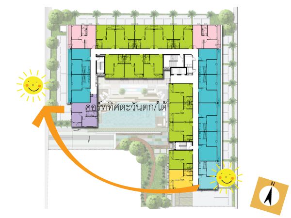 ผังคอนโด เดอะ ซีรี่ส์ อุดมสุข นั้นวางเป็นรูปตัว C ที่มีขาสองข้างไม่เท่ากัน  และล้อมรอบคอร์ทซึ่งเปิดออกด้านทิศใต้  ซึ่งจริงๆแล้วมุมนี้ค่อนข้างรับแดดบ่ายมากทีเดียวครับ  แต่ส่วนหนึ่งผมคิดว่าที่วางผังแบบนี้เพราะพยายามเปิดรับมุมมองจากทางเข้าหลักของถนน  และไม่ต้องการให้คนที่ใช้ Facilities ส่วนกลางอยู่ในคอร์ทมองเห็นอพาร์ทเม้นท์ด้านหลังซึ่งไม่ได้สวยนักด้วย  ซึ่งก็ตอนยอมรับว่าช่วงบ่ายๆถ้ามาว่ายน้ำเล่นอาจจะร้อนอยู่บ้าง  เพราะตำแหน่งสระว่ายน้ำนั้นอยู่ริมสุดเลย  ไม่มีเงาของตัวอาคารมาบังแดดให้เท่าไหร่ครับ