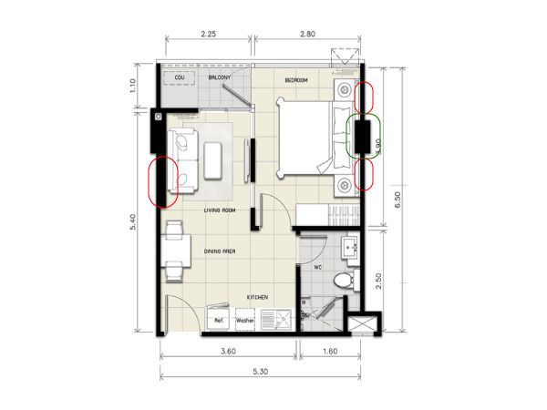 ถ้าเป็นแบบ 1 ห้องนอนที่ห้องติดริมผนังอาคารด้านนอกก็จะมีช่องหน้าหน้าต่างเพิ่มขึ้นครับ  โดยตำแหน่งที่เจาะหน้าต่างนั้นผมวงกลมสีแดงไว้ให้ในรูปแล้วครับ  จะได้ไม่ต้องดูแปลนฟังก์ชั่นเดียวกันหลายรอบ  มันลายตา  นอกนั้นบางห้องก็จะมีการปรับเปลี่ยนดีเทลนิดหน่อยเช่นการย้ายตำแหน่งประตูทางเข้าห้องมาติดห้องน้ำ  และย้ายเคาท์เตอร์ครัวไปติดส่วนรับประทานอาหาร  ต้องลองดูเป็นห้องๆไปครับ