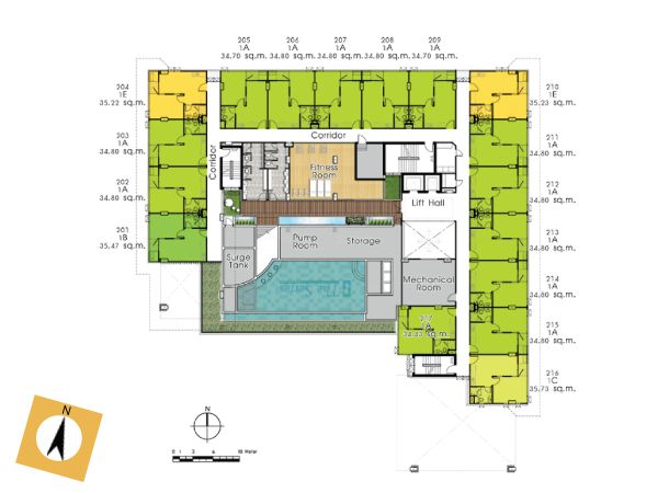 เรามาเริ่มดูแปลนที่ชั้น 2 กันครับ  ชั้น 2  นี้จะมีสระว่ายน้ำ และฟิตเนสซึ่งหันหน้าเข้าหาสระว่ายน้ำ  แต่จะไม่เห็นผิวของสระน้ำนะครับ  จะเห็นม่านน้ำที่เป็นกำแพงของสระน้ำในส่วนน้ำล้นแทน   ส่วนสระว่ายน้ำเองก็จะถูกยกสเต็ปขึ้นไป  ส่วนหนึ่งที่ต้องดีไซน์แบบนี้ก็เพราะว่าต้องหาที่ใส่ห้องปั๊ม แล้วก็ Surge Tank ของสระว่ายน้ำครับ  ก็เลยกลายเป็นได้สเปซที่เป็นม่านน้ำสวยๆมีลูกเล่นไปเลย (ถ้านึกภาพตามไม่ออก  ลองกลับไปดูรูปห้องฟิตเนสข้างบนนะครับ)