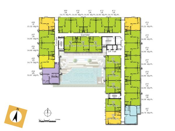 ขั้นมาที่ผังคอนโดชั้นที่ 4 – 7 จะเป็นชั้นมาตราฐานที่ห้องเหมือนกันหมดครับ  ที่เห็นสีเขียวอ่อนคือห้องแบบ 1 ห้องนอน ครับ  ส่วนแบบ 2 ห้องนอนนั้นจะอยู่เฉพาะตรงมุมๆของอาคารเท่านั้นครับ