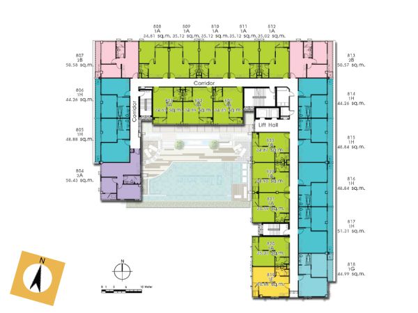 มาดูแปลนชั้นบนสุดคือชั้น 8 กันครับ  รอบๆด้านนอกนั้นจะเป็นห้องแบบใหญ่  ขนาดก็ตั้งแต่ 44-51 ตารางเมตร  ซึ่งขายหมดไปแล้วครับ  เลยไม่ได้มีแปลนละเอียดมาให้กันด้วย  จุดเด่นของห้องรอบๆของชั้นนี้คือมีระเบียงยาวตลอด  และมองไปก็จะได้วิวโล่งๆครับ  เพราะอพาร์ทเม้นท์รอบๆนั้นสูงแค่ 4-5 ชั้นเท่านั้นเอง  (เลยขายหมดเร็วเลย)