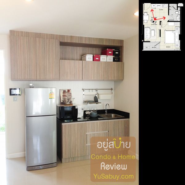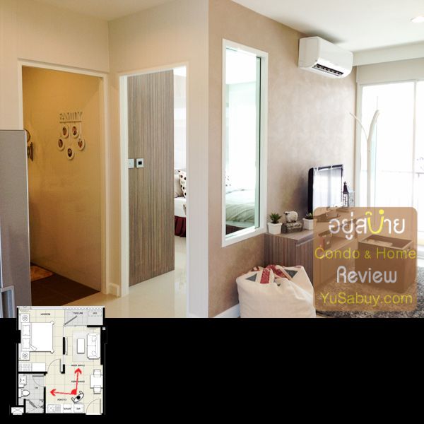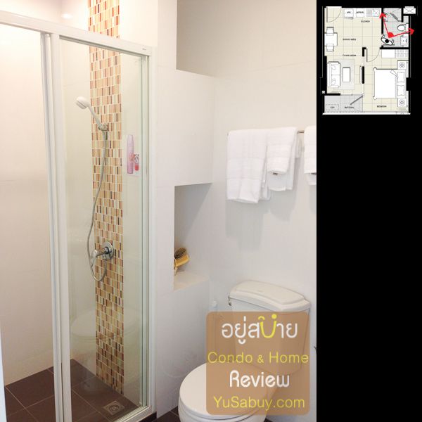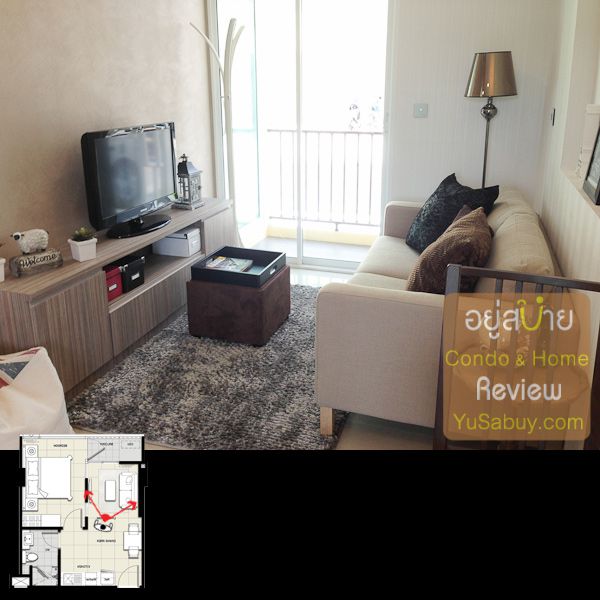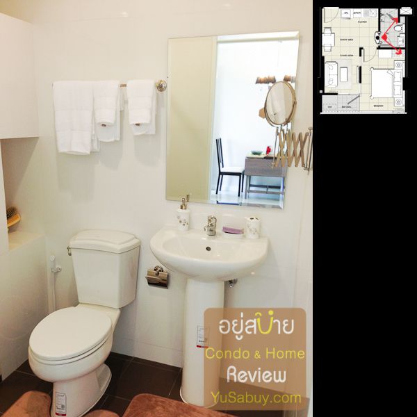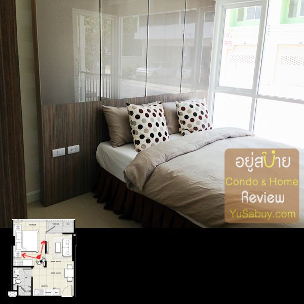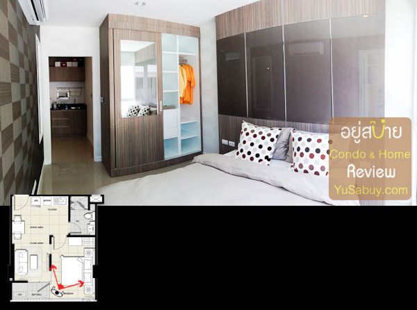 ([เพิ่มเติมข้อมูล 4/6/56] – ลืมเล่าประเด็นสำคัญไปจุดนึงครับ คือเรื่องของตำแหน่งหัวเตียง  เป็นประเด็นที่ไม่ค่อยถูกใจเท่าไหร่  เพราะถ้าลองสังเกตดูจะเห็นว่าการวางช่วงเสาของแต่ละห้องจะมีเสาโครงสร้างรับน้ำหนักของอาคารอยู่ในตำแหน่งหัวเตียงพอดี  ซึ่งห้องจริงไม่มีการ built-in ผนังตรงหัวเตียงมาให้แบบในห้องตัวอย่าง  เวลาตั้งเตียงจะดูไม่ลงตัวมากๆ  ถ้าอยากให้ดีก็ต้องมาตกแต่ง Built-in เพิ่มเองเพื่อปิดเสาที่ลอยออกมาตรงกลางหัวเตียง  (ลองนึกภาพหัวเตียงจะวางลอยอยู่ติดเสา  แต่ไม่ติดผนังนะครับ)  ตรงนี้ผมว่าเป็นจุดหนึ่งที่ไม่ค่อยลงตัวในสเปซห้องนี้)