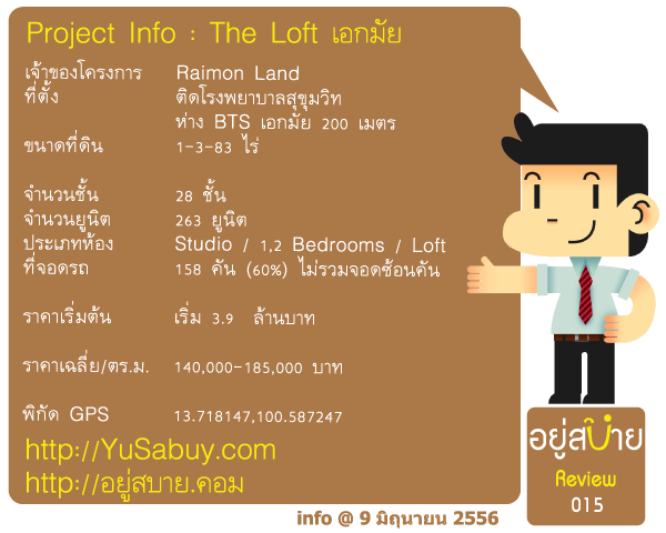 อยู่สบายพาไปดูคอนโด The Lofts Ekkamai  คอนโดใหม่ล่าสุดจาก Raimon Land ครับ   ที่ตั้งของโครงการอยู่บนถนนสุขุมวิทห่างจาก BTS เอกมัย 200 เมตร เป็นระยะเดินได้สบายๆซึ่งแน่นอนว่าทำเลแบบนี้ราคาคงไม่ถูกแน่ๆทาง  Raimon Land  เปิดตัวคอนโด The Lofts Ekkamai มาด้วยราคาเฉลี่ยต่ำสุดที่ 140,000 บาทต่อตารางเมตรครับ  ปกติแล้ว Raimaon Land  นี่เขาถนัดทำของแพงๆกับตลาดบนๆอยู่แล้วครับ  เอาชื่อ 185 ราชดำริ กับ The River เป็นประกันได้  แถม The Lofts นี่ยังเป็นโปรเจคเปิดตัวรับ CEO คนใหม่หลังจากที่กลุ่มทุนจากสิงคโปร์เข้ามาซื้อกิจการไปเมื่อเดือนก่อนด้วยครับ