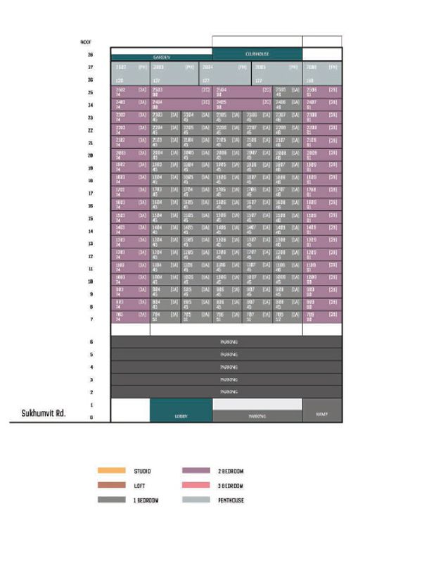 ส่วนห้องแบบ  Studio , 1 ฺBedroom และ Duplex จะอยู่ตรงกลางอาคารครับ  โดยแบบ 1 ห้องนอน 45 ตร.ม.นั้นจะหันหน้าไปทางพระโขนง  ส่วน Studio และ Duplex จะหันหน้าไปทางแยกเอกมัยครับ  โดยห้องแบบ Studio จะอยู่ที่ชั้น 7-15  ส่วน Duplex จะไปเริ่มอยู่ที่ชั้น 16 ขึ้นไปครับ  ตำแหน่งรวมๆคร่าวๆนั้นดูจากแปลนด้านล่างได้เลยครับ