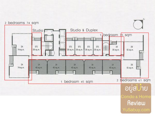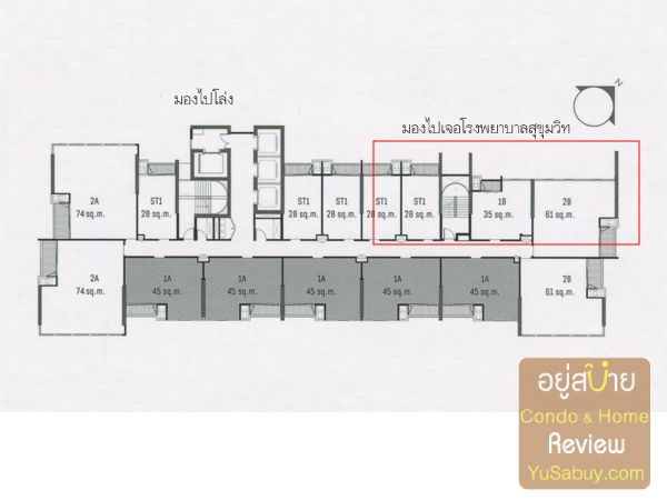 ตำแหน่งห้องแบบต่างๆในแต่ละชั้นจะเหมือนๆกันครับ  ห้องแบบ 2 ห้องนอน จะอยู่เป็นห้องมุมด้านหน้าและหลัง  โดยห้องด้านหน้าเป็นแบบห้องพื้นที่ 74 ตร.ม.  ซึ่งจะเยอะกว่าห้องด้านหลังที่มีพื้นที่ 61 ตร.ม.