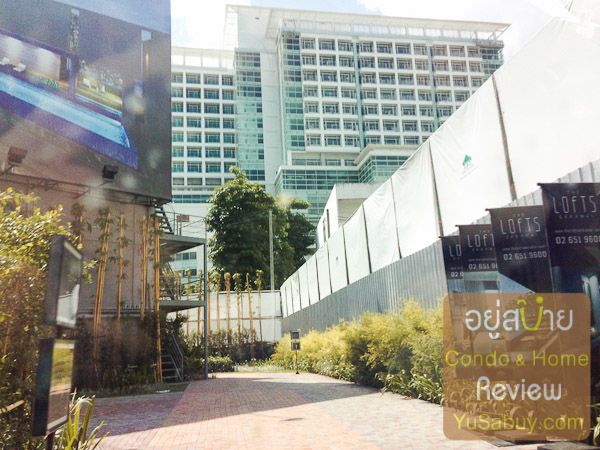 มาเล่าให้ฟังว่าพื้นที่รอบๆมีอะไรบ้างครับ  โดยตำแหน่งที่ตั้งของคอนโด The Lofts ต้องถือว่าเกาะอยู่ตรง Hub  ความเจริญในย่านนี้สุดๆครับ  ด้านทิศตะวันตกเฉียงเหนือของคอนโดจะติดกับโรงพยาบาลสุขุมวิทครับ  ตรงนี้ชั่งใจลำบากเหมือนกันว่าเป็นข้อดีหรือข้อเสีย  ข้อเสียเลยคือห้องบางตำแหน่งในทิศตะวันตกเฉียงเหนือจะโดนบังวิว  แต่ข้อดีคือไม่ต้องเห็นวิวเป็นเมรุของวัดธาตุทอง   ส่วนด้านหน้าคอนโดเลยมีตึกแถวเหลืออยู่  3-4  ห้องครับ  ไม่แน่ใจว่าเจ้าของเขาไม่ขายหรือทางไรมอน แลนด์เลือกที่จะไม่ซื้อ  ซึ่งตึกแถวด้านหน้านั้นเป็นคลินิคหมอฟันแล้วก็ร้านตัดผมท่านชายครับ