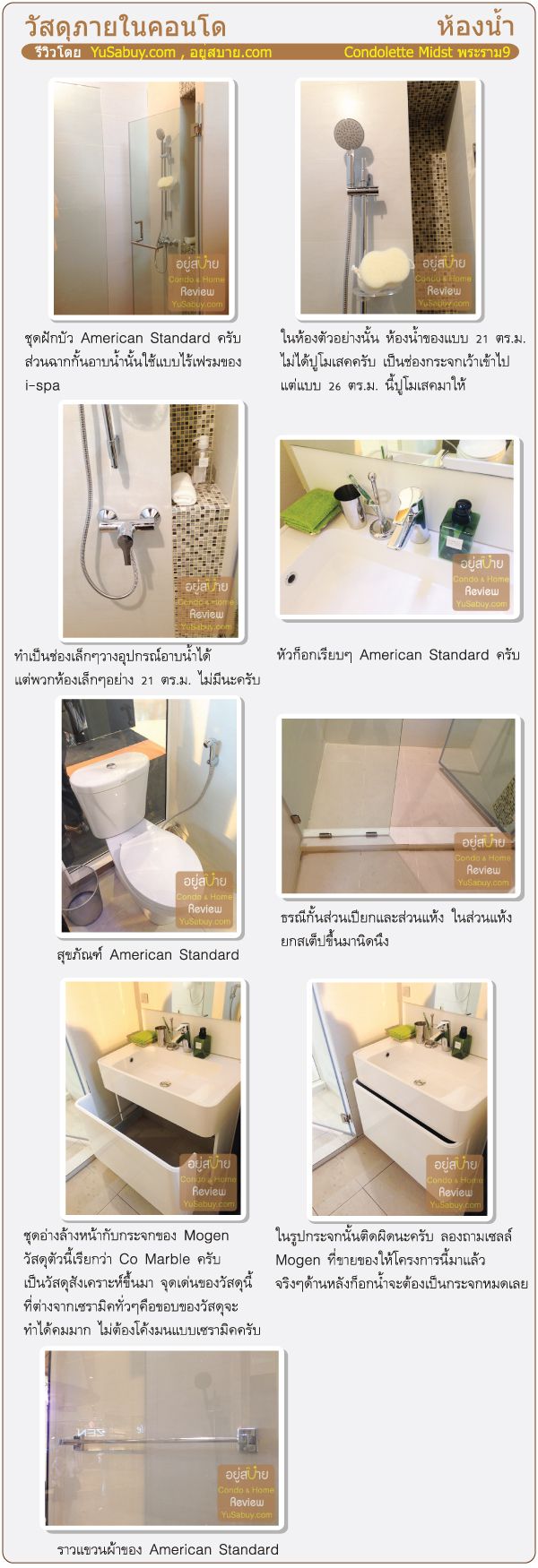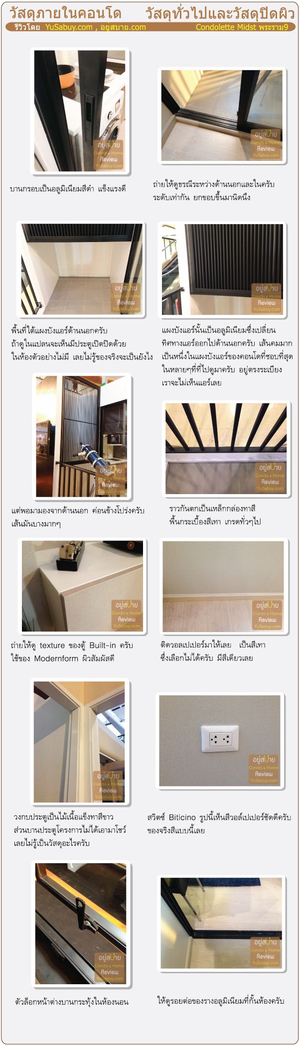 หลังจากดูรีวิวเรื่องสเปซเสร็จ คราวนี้มาดูรีวิวเรื่องวัสดุที่ได้กันครับ ในภาพรวมคอนโดเลต มิสท์ ให้วัสดุมาดีครับ พวกชุดครัว เฟอร์นิเจอร์Built-in กับอุปกรณ์สุขภัณฑ์ในห้องน้ำให้มาดีครับ ผมไม่ค่อยประทับใจกระเบื้องห้องน้ำเท่าไหร่ แต่ภาพรวมก็ถือว่าให้วัสดุในเกณฑ์ที่ดีอยู่ครับ แต่ในเรื่องการให้คะแนนส่วนนี้ก็พิจารณายากเหมือนกัน เพราะช่วงระดับราคานั้นกว้างมากครับ (108,000 – 170,000 บาท/ตร.ม.) ราคานั้นคร่อม Segment กันอยู่ ถ้ามองว่ามันเป็นวัสดุที่ให้มาในห้องระดับราคาประมาณแสนต้นๆก็จะถือว่าน่าประทับใจทีเดียว แต่ถ้ากลับมาดูว่าเป็นวัสดุที่ให้มาในห้องที่ระดับราคาแสนปลายๆ แบบนี้ผมก็ยังไม่ค่อยประทับใจนักครับ