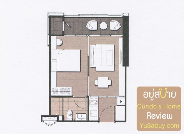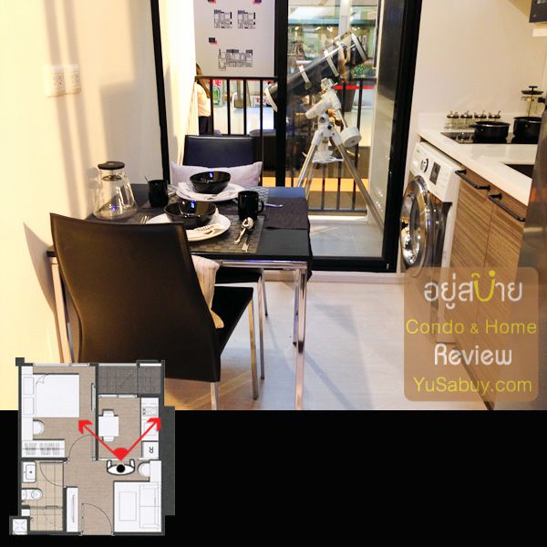 แปลนแบบนี้โครงการเอามาทำเป็นห้องตัวอย่าง 1 ใน 2 ห้องครับ แล้วก็เป็นห้องขนาดเล็กสุดของโครงการด้วย เป็นตัวทำราคาเปิดขายที่ 2.33 ล้านบาท การวางแปลนนั้นจะเสียก็ตรงที่ว่าไม่มีที่สำหรับโซฟาขนาดเล็กเอาไว้นั่งเล่น มีแต่เก้าอี้นั่งรับประทานอาหารหรือนั่งทำงานอย่างจริงจังไปเลย ขาดพื้นที่ relax ไปหน่อยครับ