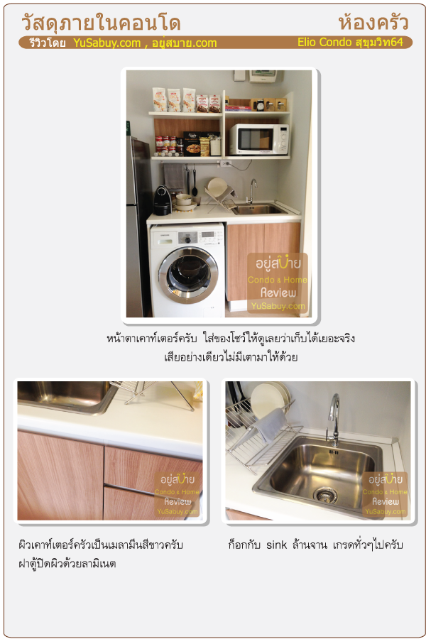 รีวิวดูสเปซภายในห้องให้เห็นภาพกันไปแล้วก็มาดูรีวิวในรายละเอียดวัสดุต่อครับ ภาพรวมของวัสดุ Elio Condo ผมมองว่าให้มาค่อนข้างจะโอเคกับระดับราคานะครับ เฟอร์นิเจอร์แบบ Fully Furnished ที่ให้มาก็โอเคครับ โดยรีวิวเรื่องวัสดุของอยู่สบา่ยจะแยกเป็น 3 ส่วน คือรีวิววัสดุห้องครัว, รีวิววัสดุห้องน้ำ และรีวิววัสดุทั่วไปกับวัสดุปิดผิว(finishing)ครับ ลองอ่านดูจากภาพกราฟฟิกด้านล่างได้เลย