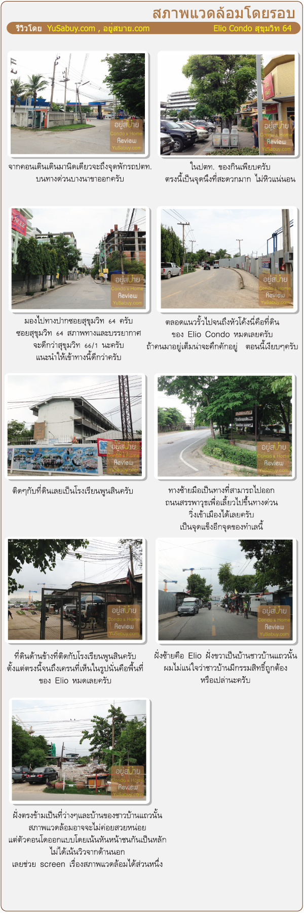ลองดูผังกราฟฟิกที่ผมทำสำรวจพื้นที่รอบๆเอาไว้ครับ จะได้เห็นภาพว่ามีอะไรอยู่ตรงไหนบ้าง ดูในรูปจะเห็นว่าที่ตั้งโครงการนั้นอยู่ตรงจุดเชื่อมต่อของทั้งสองซอยพอดีครับ ด้านทิศใต้ของที่ดินนั้นเป็นโรงเรียนชื่อโรงเรียนพูนสิน ในพื้นที่เิดิมของคอนโดจะเห็นว่าเป็นโรงงานเก่าๆอยู่ครับ อีกหน่อยก็คงรื้อไปหมด โดยคอนโดเฟสแรกที่ Elio เปิดขายจะอยู่ฝั่งใกล้ซอยสุขุมวิท64 ส่วนพื้นที่สีส้มที่ผมไฮไลท์ไว้คือส่วนต่อขยายเฟสอื่นๆในอนาคต จุดที่ส่งเสริมศักยภาพมากของทำเลนี้คือซอยด้านข้างโรงเรียนนั้นสามารถวนไปขึ้นทางด่วนเข้าในเมืองได้เลยโดยไปทะลุออกที่ถนนสรรพาวุธแล้วเลี้ยวซ้ายเข้าทางด่วนซึ่งตรงนี้สะดวกมาก แล้วก็มีร้านอาหารมากพอควรในจุดพักรถของปตท.ข้างๆคอนโด เรียกว่าหาของกินสะดวกไม่มีอดแน่นอน ส่วนข้อด้อยก็เป็นเรื่องของสภาพแวดล้อมนิดนึงครับ เพราะถัดจากด้านหน้าโครงการเฟสแรกไปจะเป็นบ้านของชาวบ้านแถวนั้นซึ่งอยู่มาก่อนแล้วเดิมไม่ค่อยเป็นระเบียบเรียบร้อยเท่าไหร่ แล้วก็คูระบายน้ำก็สีไม่ค่อยน่าดูนัก ยังดีที่มีแนวต้นไม้บังอยู่ ตรงนี้ก็ต้องลองพิจารณาดูรับว่ารับได้หรือเปล่า ไม่มีอะไรเฟอร์เฟคเนอะ