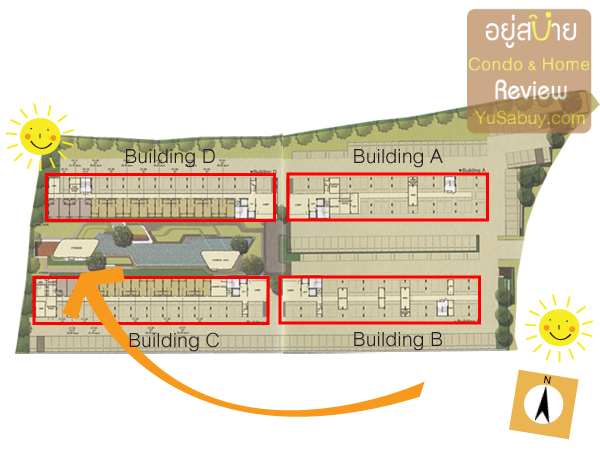 โครงการในเฟสแรกแบ่งเป็น 4 อาคารครับ Building A และ B จะอยู่ด้านหน้าสุด ส่วน Building C และ D จะอยู่ด้านหลังซึ่งใกล้กับทางด่วน โครงการเลือกวางผังโดยให้อาคารหันหน้าเข้าหากันแบบเข้าแถวหน้ากระดานตามสูตรของคอนโดราคาประหยัดทั่วไปครับ สามารถทำพื้นที่ขายได้มาก ด้านทิศเหนือของ Building A กับ D นั้นจะไม่โดนบังวิวครับ เพราะิีอีกด้านเป็นปั๊มปตท. ซึ่งไม่มีทางขายไปสร้างตึกอย่างอื่นแน่นอน เรียกว่ามองไปแล้วค่อนข้างโล่ง เพียงแต่จะติดคูระบายน้ำด้านข้างโครงการนะครับ สำหรับ Building C กับ D ด้านทิศใต้นั้นขอให้นึกไว้ก่อนว่าอีกหน่อยก็จะมีเพื่อนบ้านเป็นตึกอื่นของ Elio เฟสต่อๆไปขึ้นมาแน่นอน จะไม่ได้โล่งนะครับ ด้านทิศทางแดดนั้นในคอร์ทจะร่มตลอดวันครับ เพราะ Building B กับ C ช่วยบังแดดให้ทั้งวันเลย อาจจะมีชั้นบนๆของ Building A กับ B ที่โดนแดดบ้างเนื่องจากแสงแดดนั้นแยงเข้ามาถึงครับ ส่วนชั้นล่างๆของ Building A กับ D ถึงแม้ว่าจะอยู่ทิศใต้แต่ก็ไม่น่าจะร้อนอะไรครับ