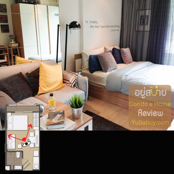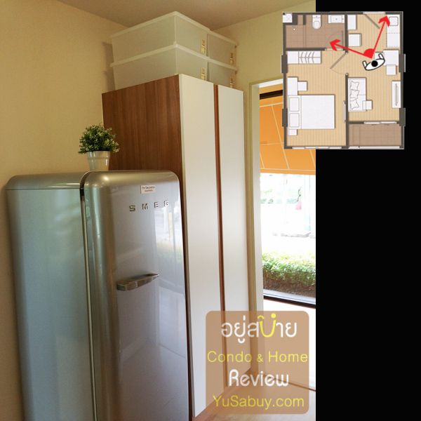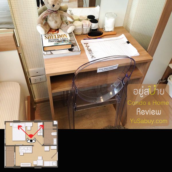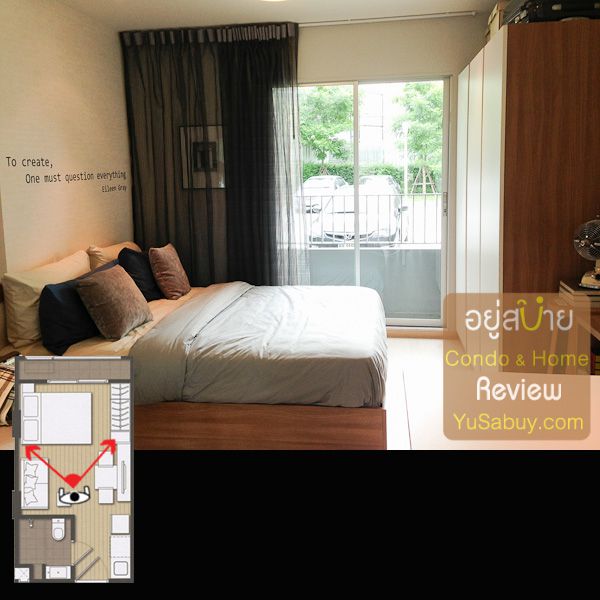 แปลนห้องแบบ 1 ห้องนอนก็เป็นสูตรสำเร็จทั่วๆไปครับ ทำได้เป็นสัดส่วนดี ขนาดกระทัดรัดใช้งานได้ อาจจะมีสเปซบางส่วนที่เวลาเดินจริงๆในห้องแล้วดูจะแคบไปหน่อยอย่างพื้นที่ตรงปลายเตียงครับ(ผมถ่ายรูปมาให้ดูในส่วน”เปิดห้องมองสเปซ”ด้านล่าง) ส่วนพื้นที่ระเบียงผมวัดได้ประมาณ 95 ซม. ใช้งานได้สบายๆครับ แต่แอร์จะหันหน้าเป่าเข้าหาระเบียงเพราะระเบียงของแบบ 1 ห้องนอนจะมีความยาวน้อยกว่าแบบสตูดิโอครับ คนดีไซน์คงมองว่าถ้าหันหน้าคอมเพรสเซอร์แอร์ออกไปด้านนอกแล้วจะมากินพื้นที่ของระเบียง จุดนี้ก็ทำให้ได้พื้นที่ระเบียงเต็มเม็ดเต็มหน่วยขึ้น แต่ก็แลกมาด้วยลมร้อนที่ต้องเป่าใส่ระเบียงครับ