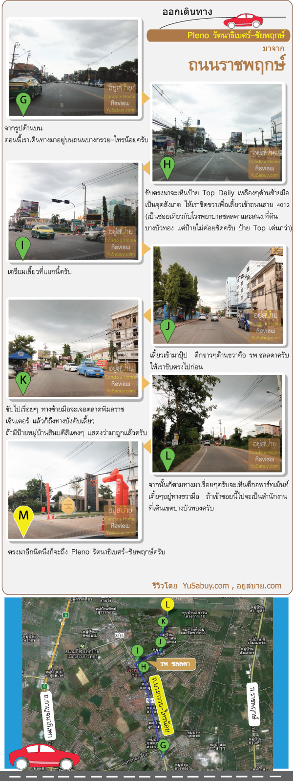 วันนี้เราพาไปรีวิวโดยใช้เส้นทางจากถนนราชพฤกษ์ครับ เดินทางมาจากราชพฤกษ์ขาออกขับรถตรงไปเรื่อยๆเพื่อจะเลี้ยวซ้ายเข้าถนนรัตนาธิเบศร์ตามแนวรถไฟฟ้าสายสีม่วงครับ จากนั้นขับตรงไปในช่องทางคู่ขนานเพื่อจะเลี้ยวขวาเข้าถนนบางกรวย-ไทรน้อย แล้วตรงไปบนถนนบางกรวย-ไทรน้อยเรื่อยๆครับ เลี้ยวเข้าซอยโรงพยาบาลชลลดา(ถนนทางหลวงชนบทหมายเลข 4012) ถ่อนถึงซอยสังเกตว่าจะมีปี๊มแก๊ส Susco อยู่ทางขวามือ และตรงแยกที่เลี้ยวเลยจะมีป้าย Top Daily อยู่ทางซ้ายนะครับ พอเลี้ยวขวาไปแล้วให้ขับตรงไปตามทางเรื่อยๆก็จะถึงทาวน์โฮมพลีโน รัตนาธิเบศร์-ชัยพฤกษ์ เป้าหมายรีวิวทาวน์เฮ้าส์ของอยู่สบายในวันนี้ครับ