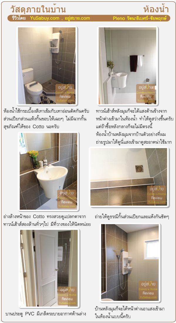 ภาพรวมของวัสดุทาวน์โฮมพลีโน่ รัตนาธิเบศร์-ชัยพฤกษ์ ให้มาโอเคกับระดับราคานะครับ ใช้งานได้ตามมาตราฐาน เลือกพวกวัสดุสุขภัณฑ์ได้หน้าตาดูดีทีเดียว แต่การก่อสร้างอาจจะยังดูไม่ค่อยเรียบร้อยเท่าไหร่นัก ในบ้านตัวอย่างงานฉาบผิว precast ยังไม่ค่อยเนี๊ยบ ถ้าบ้านจริงที่ส่งมอบให้ลูกค้าเก็บงานให้เนียนกว่านี้อีกสักหน่อยโดยรวมก็น่าจะโอเคครับ