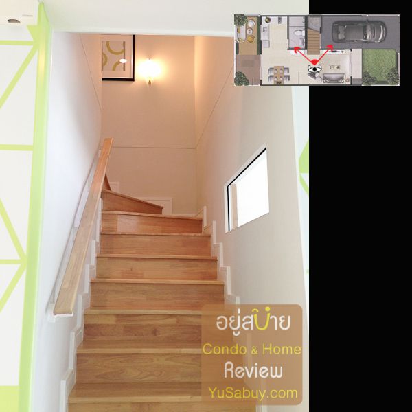 บ้านแบบนี้มี 3 ห้องนอน 2 ห้องน้ำ 1 ที่จอดรถ เปิดประตูเข้ามาจะเห็นสเปซโล่งยาวไปถึงด้านหลัง ส่วนพักผ่อนกับส่วนรับประทานอาหารเรียงต่อกันแบบทาวน์เฮ้าส์ทั่วๆไปครับ แบบนี้จะวางตำแหน่งห้องน้ำชั้นล่างอยู่ใต้บันได และเอาประตูทางเข้าไปไว้ตรงพื้นที่ทำครัว ดูเป็นสัดเป็นส่วนดี แต่ครัวนั้นไม่ได้ให้มานะครับ เป็นบ้านเปล่าซึ่งเตรียมระบบท่อไว้เฉยๆ