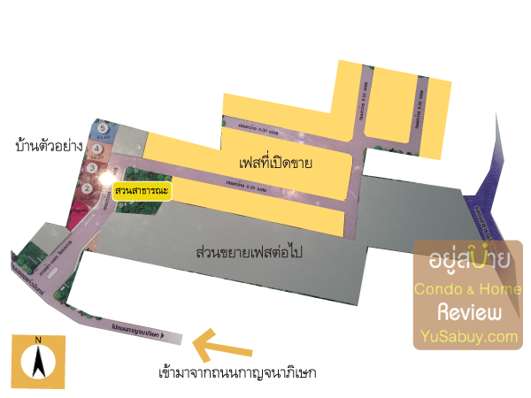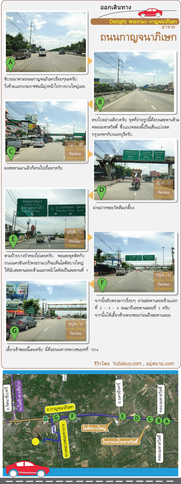 รีวิววันนี้ผมใช้เส้นทางบนถนนกาญจนาภิเษกครับ ขับรถตรงมาตั้งแต่เพชรเกษมเรื่อยๆข้ามแยกบรมราชชนนี ผ่านสะพานข้ามคลองมหาสวัสดิ์ซึ่งเป็นจุดแบ่งเขตพื้นที่กรุงเทพฯกับจังหวัดนนทบุรี พอเลยจุดตัดกับถนนนครอินทร์(พระราม5)ก็จะเจอโลตัสบางใหญ่อยู่ทางซ้ายมือครับ จากจุดนี้วิธีหาที่ัตั้งโครงการง่ายๆไม่ให้ขับเลยคือนับสะพานลอยเอาครับ ถือว่าสะพานลอยหน้าโลตัสบางใหญ่เป็นสะพานลอยที่ 1 จากนั้นขับตรงไปเรื่อยๆ แล้วก็ไปเลี้ยวขวาตรงก่อนถึงสะพานลอยที่ 5 ครับ นับแบบนี้ไม่มีทางหลงแน่นอน เพราะถนนใหญ่แบบนี้ขับเลยนิดเดียวต้องไปกลับรถมาไกลเลย เพราะปากซอยก็จะสังเกตยากครับ คล้ายๆกันไปหมด