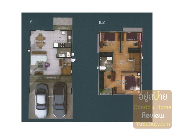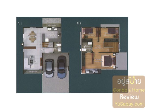 บ้านแบบนี้มี 3 ห้องนอน 2 ห้องน้ำ 2 ที่จอดรถ ที่จอดรถนั้นจะเสียบเข้ามาในตัวบ้านทั้ง 2 คัน ด้านหน้ามีเฉลียงยาวตลอดแนว จุดที่น่าสนใจคือตำแหน่งการวางทีวีครับ ปกติถ้าแปลนบ้านที่จัดบันไดไว้แนบริมผนังแบบนี้มักจะจัดเฟอร์นิเจอร์ด้วยการวางตำแหน่งทีวีไว้ตรงด้านข้างบันได แต่แบบนี้หันตำแหน่งหน้าทีวีออกมาด้านหน้าบ้าน ทำให้สามารถดูทีวีในเวลาทานอาหารได้ด้วย ส่วนพื้นที่ด้านข้างบันไดนั้นใช้เป็นห้องเก็บของแทนครับ นอกนั้นตำแหน่งห้องน้ำกับครัวก็ปกติทั่วๆไป ได้ครัวใหญ่ดี
