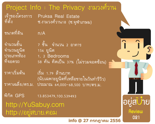 อยู่สบายพาไปรีวิวคอนโด The Privacy งามวงศ์วาน ซึ่งเป็นคอนโด low rise ตัวใหม่ของพฤกษาที่เพิ่งเปิดตัวไปครับ  ทำเลที่ตั้งนั้นอยู่ในซอยงามวงศ์วาน 18  ระยะทางจากปากซอยเข้ามาประมาณ 400 เมตร  แบรนด์ The Privacy Condo  ของพฤกษานี้ทำที่งามวงศ์วานเป็นที่แรกครับ  และกำลังจะมีเปิดตัวติดๆกันอีกที่ซอยเรวดีแถวๆกระทรวงสาธารณะสุขครับ   วันนี้อยู่สบายมารีวิวของที่งามวงศ์วานก่อน   ซึ่งก่อนหน้านี้ได้พรีวิวทำเลและข้อมูลคร่าวๆเบื้องต้นในเรื่องทำเลที่ตั้งและสภาพแวดล้อมไปแล้ว   รีวิวฉบับนี้เลยเป็นการอัพเดตรีวิวฉบับเต็มให้หลังจากเปิดขายอย่างเป็นทางการครับ
