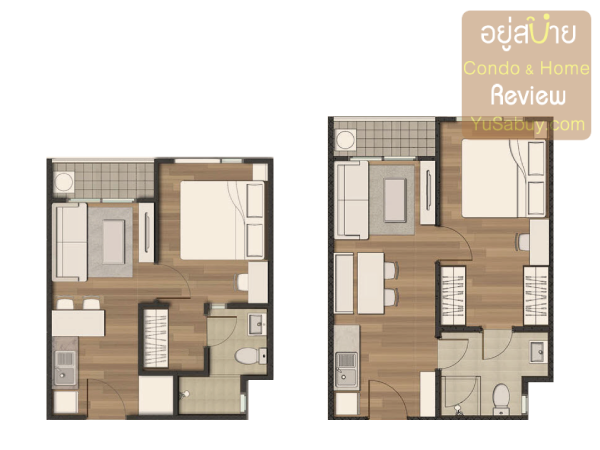 โดยหลักๆของตำแหน่งการวางฟังก์ชั่นนั้นคล้ายๆกันครับ  ต่างกันในดีเทลนิดหน่อย  ซึ่งก็ทำได้ลงตัวทั้ง 2 แบบ แบบ 28 ตารางเมตร (แปลนซ้ายมือ) เข้ามาก็จะมีส่วนเก็บของกับส่วนเคาท์เตอร์ครัวอยู่ทางหน้าห้องครับ  ในห้องนอนนั้นได้พื้นที่ืทำ Walk-in closet  ด้วย  ประตูเข้าห้องน้ำก็หลบไปจากพื้นที่ในห้องนอนเรียบร้อยครับเพียงแต่ห้องน้ำจะต้องเข้าผ่านห้องนอนอย่างเดียว  เข้าจากด้านนอกไม่ได้ ส่วนห้องแบบ 30 ตารางเมตรข้อแตกต่างนั้นก็จะได้พื้นที่ตู้เสื้อผ้าเพิ่มขึ้นมาอีก  แต่จะเสียพื้นที่ส่วนเก็บของเล็กๆหน้าห้องไปครับ  จุดที่ผมชอบในห้องแบบ 30 ตารางเมตรนี่คือประตูห้องน้ำที่เปิดจากห้องนอนและเปิดจากทางด้านนอกมันไม่ชนกันครับ  จัดแปลนออกมาแล้วดูใช้พื้นที่น้อยๆได้ประโยชน์ดี