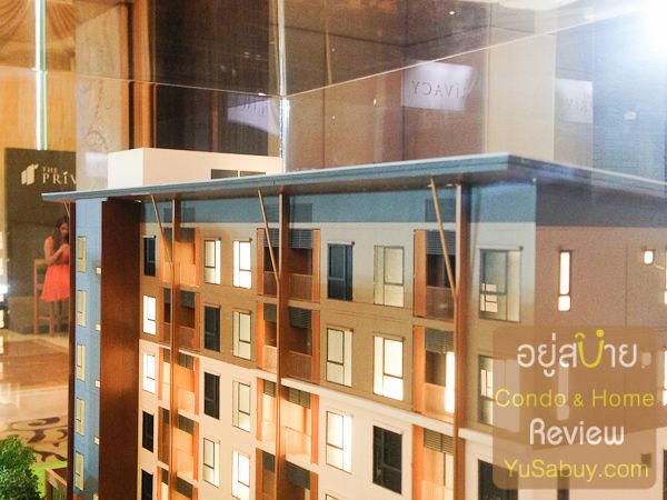 จุดเด่นของโครงการน่าจะเป็นเรื่องที่ความหนาแน่นน้อยครับ  โดยปกติแล้วคอนโด low rise มักจะถูกจำกัดความสูงไว้ที่ระยะ 23 เมตร ตามกฎหมาย  ซึ่งโครงการส่วนใหญ่ก็จะออกแบบมา 8 ชั้น  แต่ของ The Privacy ทำแค่ 7 ชั้น  ในส่วนของรูปทรงอาคารก็วางเป็นเส้นตรงง่ายๆครับ  ไปเล่น pattern กับองค์ประกอบตกแต่งหน้าตาอาคาร เช่น pattern ของสี  หรือการใส่ค้ำยันแทน