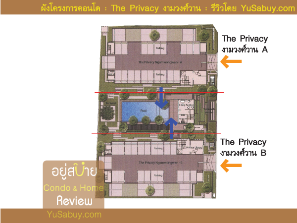 พอเปิดผังโครงการมาเราจะเห็นตัวคอนโด The Privacy แยกเป็น 2 ตึกอย่างชัดเจน  ทางเข้าก็แยกกันด้วยครับ  คือจริงๆแล้ว The Privacy นี่ทำลักษณะเป็นคอนโด 2 โครงการติดกันครับ (The Privacy Ngamwongwan A และ The Privacy Ngamwongwan B)   แล้วให้พวก Facility  ส่วนกลางนั้นให้ทั้ง 2 โครงการแชร์ร่วมกัน  เหตุผลหลักๆในเชิงกฎหมายคงมาจากเรื่องการซอยยูนิตขายให้จำนวนน้อยลงเพื่อจะได้สร้างได้เร็วไม่ต้องเสียเวลาเข้า  EIA    โครงการจึงต้องมีทางเข้าของทั้ง 2 ตึกแยกเด็ดขาดออกจากกันเลย  มี Security Point 2 จุด  และเมื่อขายหมดทั้ง 2 ตึก  พื้นที่ส่วนกลางตรงที่มีคลับเฮ้าส์และสระว่ายน้ำ  โครงการก็จะโอนให้นิติบุคคลของทั้งโครงการ The Privacy Ngamwongwan A และ The Privacy  Ngamwongwan B ใช้ร่วมกัน  แชร์ค่าส่วนกลางร่วมกันครับ พอเข้าใจคอนเซ็ปแล้วก็ลองดูที่ผังโครงการครับ  อยู่สบายตีแนวเส้นสีแดงแบ่งขอบเขตของโครงการ A กับ B และำืพื้นที่ส่วนกลางไว้ให้ดูด้วยครับ  ลูกศรสีส้มคือทางเข้าแต่ละโครงการ  ส่วนลูกศรสีน้ำเงินคือจุดที่เดินเชื่อมเข้าสู่พื้นที่ส่วนกลางได้