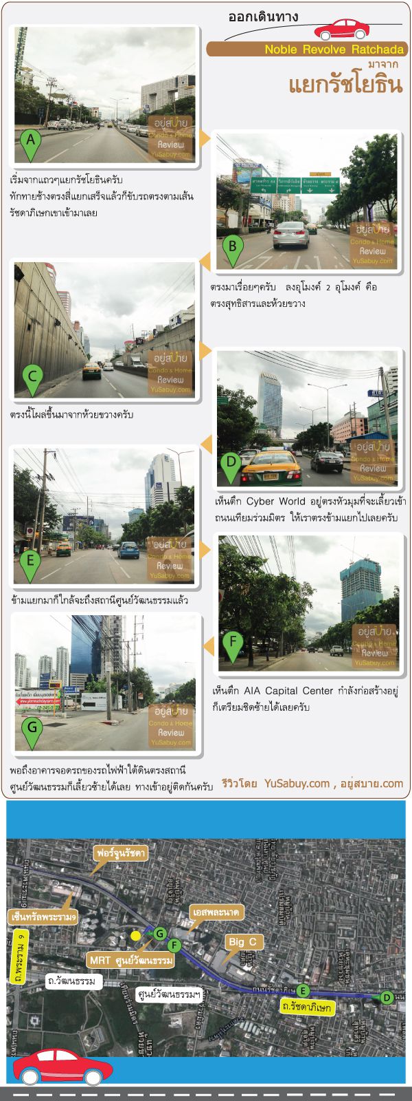 ที่ตั้งของ Noble Revolve Ratchada นั้นหาไม่ยากครับ ถ้าใครจะใช้รถไฟฟ้าใต้ดินก็ไปขึ้นตรงสถานีศูนย์วัฒนธรรมได้เลย ส่วนผมเริ่มต้นเดินทางวันนี้ผมใช้ถนนรัชดาภิเษกขาเข้าครับ มาจากสี่แยกรัชโยธินขับตรงไปเรื่อยๆ ผ่านแยกรัชดา-ลาดพร้าว ลอดอุโมงค์ตรงแยกสุทธิสารและห้วยขวาง ไปเรื่อยๆจนพอเห็น Esplanade Ratchada ก็ให้เตรียมชิดซ้ายไว้ครับ แล้วพอถึงอาคารเตี้ยๆที่เป็นที่จอดรถของสถานีรถไฟฟ้าใต้ดินศูนย์วัฒนธรรม ก็ให้เลี้ยวซ้ายต่อจากตรงนั้นได้เลย หาง่ายมาก