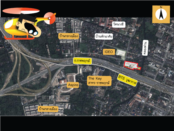 ถึงที่ดินของโครงการแล้วก็ขึ้นเฮลิคอปเตอร์กันต่อครับ ตัวโครงการนั้นจะอยู่ใกล้ๆกับคอนโดอีกตัวที่เพิ่งเปิดคือ IDEO วุฒากาศ ซึ่งอยู่สบายก็เคยพรีวิวข้อมูลเบื้องต้นไว้แล้ว แต่ยังไม่ได้ลงรีวิวละเอียด ระหว่างตัวคอนโดทั้ง 2 โครงการมีถนนซอยเล็กๆชื่อซอยกัลปพฤกษ์กั้นอยู่ The Key นั้นจะอยู่ตรงปากซอย ส่วน IDEO จะขยับเข้าไปในซอยอีกหน่อย ตำแหน่งที่ดินนั้นเยื้องๆกันอยู่ ถือเป็นโชคดีของคนซื้อทั้งสองโครงการไป เพราะ้ถ้าเกิดไปซ้อนติดกันเมื่อไหร่ก็จะมีด้านนึงที่โดนบังวิวไม่เห็นอะไร