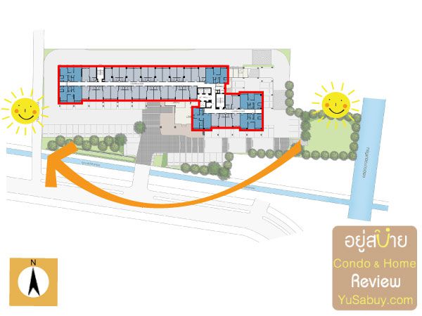 ตัวอาคารที่วางในแนวเส้นตรงเกือบขนานกับแนวตะวันออกตะวันตกแบบนี้ทำให้ห้องฝั่งที่หันด้านทิศเหนือนั้นค่อนข้างจะร่มสบายครับ แต่จะไม่ค่อยมีวิวอะไร ถ้าอยากได้วิวถนนกับแนวเส้นรถไฟฟ้าก็จะต้องมาพร้อมกับความร้อนจากแดดและก็เสียงจากถนนทางยกระดับครับ