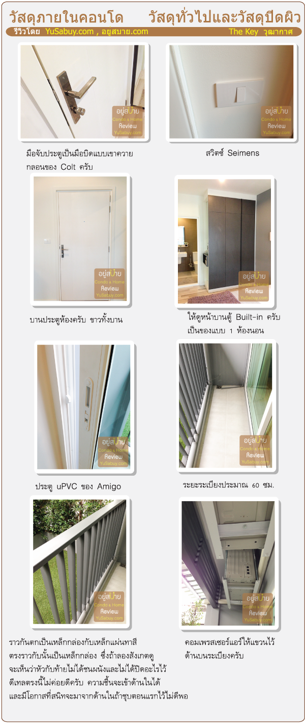 ห้องที่ให้มาเป็น Fully-Fitted มี built-in ชิ้นใหญ่ๆให้ เช่น เคาท์เตอร์ครัว , ชั้นวางของ , ตู้เสื้อผ้า ส่วนเฟอร์นิเจอร์ไม่ได้ได้มาครับ เป็นห้องโล่งๆ ภาพรวมของวัสดุก็ดูโอเคครับ กลางๆตามมาตราฐานราคา มีบางชิ้นดูลดสเปกอยู่บ้างเช่นพวกธรณีประตูทางเข้าห้องน้ำที่ใช้ PVC แล้วก็มีดีเทลของราวกันตกที่ไม่ได้ปิดหัวท้าย ความชื้นอาจจะเข้าไปได้ง่าย ซึ่งผมเขียนอธิบายไว้ในรูปกราฟฟิกแล้วครับ