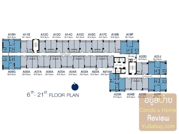 พอเห็นทิศทางและมุมมองของตัวอาคารรวมๆแล้ว ก่อนจะไปดูแปลนห้องก็มาดู Typical Floor Plan รวมๆกันก่อน แปลนตั้งแต่ชั้น 5 – 21 ก็จะเหมือนๆกันครับ มีแบบ 2 ห้องนอนอยู่ตรงมุมอาคาร นอกนั้นก็เป็น 1 ห้องนอนหมด