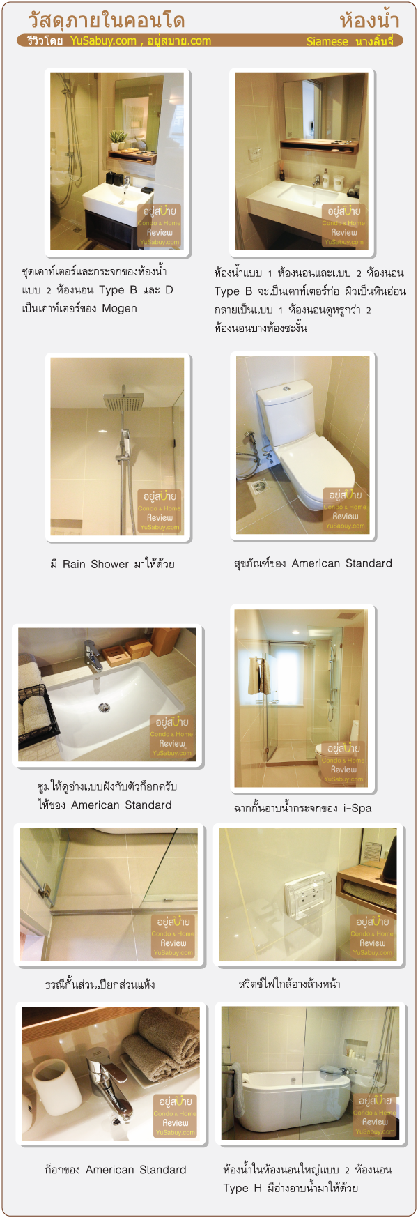 มีข้อสังเกตตรงห้องน้ำเพิ่มเติมนิดนึง ถ้าลองดูห้องน้ำแบบ 1 ห้องนอนจะเห็นว่าได้เคาท์เตอร์แบบก่อ มี Top หินอ่อนสวยงาม แต่พอเป็นแบบ 2 ห้องนอนบางแบบกลับใช้เคาท์เตอร์สำเร็จมาติดตั้ง ความหรูก็ดูเทียบกับแบบ 1 ห้องนอนไม่ได้ ผมเลยแอบงงๆกับการเลือกวัสดุอยู่เหมือนกันครับ ทั้งๆที่แบบ 2 ห้องนอนก็ราคาสูงกว่าอยู่พอควร