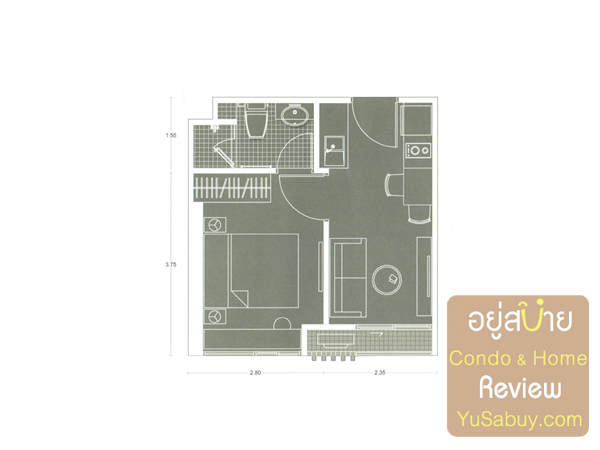 แปลนแบบนี้ก็จะค่อนข้างคล้ายกับแบบด้านบนครับ ต่างกันแค่ตำแหน่งของเคาท์เตอร์ครัวที่จะยาวอยู่ด้านเดียวกันส่วนอีกฝั่งใช้วางโต๊ะรับประทานอาหาร ถ้าวัดพื้นที่ห้องทั้ง 2 แบบก็จะเท่ากัน แต่จะแตกต่างกันที่ระยะความกว้างห้องครับ แบบนี้จะได้พื้นที่ห้องนอนแคบกว่า 20 ซม. แต่ได้พื้นที่ด้านนอกส่วนพักผ่อนเพิ่มมา 20 ซม.แทน สงสัยเวลาเลือกห้องน่าจะต้องดูกิจกรรมยามว่างว่าชอบนอนหรือชอบตื่นมากกว่ากัน