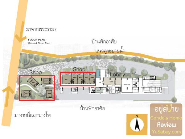 ด้านหน้าโครงการเป็นเป็นพื้นที่ร้านค้า  ซึ่งมีทั้งส่วนที่อยู่ลอยตัวใกล้ถนนใหญ่  และส่วนที่อยู่ภายในอาคารครับ  ส่วนนี้คงต้องดูเรื่องการบริหารจัดการในอนาคตว่าจะอนุญาตให้คนนอกที่ผ่านไปผ่านมาเข้ามาซื้อของในส่วนที่ติดถนนได้หรือไม่  และจะมีระบบจัดการยังไงครับ