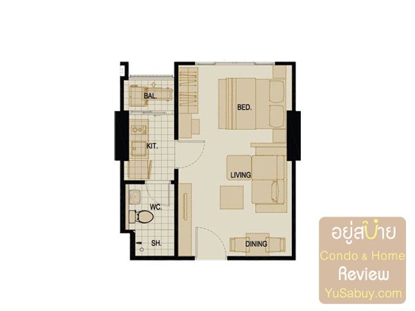 แปลนแบบสตูดิโอนี้ก็เป็นแบบหลักของโครงการครับ   รวมๆแบบนี้ก็จัดมาได้เป็นสัดเป็นส่วนดี  แยกส่วนครัวกับส่วนห้องน้ำออกไปด้านข้าง  แล้วให้สเปซส่วนรับประทานอาหาร, ส่วนพักผ่อน และส่วนนอนต่อเนื่องกันทั้งหมด  ข้อเสียแบบนี้จะมีอยู่ตรงการระบายอากาศของห้องน้ำครับ  บานประตูห้องน้ำที่ให้มานั้นเป็นบานเกล็ด  เพราะฉะนั้นยังไงอากาศก็หมุนวนกับห้องครัวแน่นอน ต้องระวังเรื่องกลิ่นตีกันนิดนึง