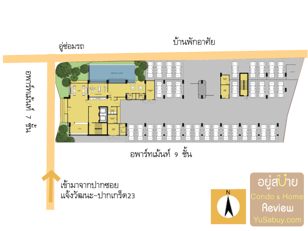 ตัวที่ตั้งโครงการนั้นอยู่ตรงหัวมุมถนนท้ายซอยแจ้งวัฒนะ 23 ครับ ถ้าขับรถมาจะต้องเลี้ยวขวาตรงถนนด้านหลังไปเข้าที่จอดรถใต้คอนโด แต่ถ้าไม่ได้ขับรถมาก็เข้าจากทางซอยแจ้งวัฒนะ 23 ได้เลย บริเวณที่จอดรถนั้นจะมีส่วนนึงที่จอดเสียบเข้าช่องจากริมถนนได้เลยซึ่งส่วนที่จอดด้านนอกนี่ก็ไม่โดนแดดเพราะอยู่ทิศเหนือและมีตัวอาคารช่วงบังให้ ที่เหลือก็ไปจอดรถใต้อาคารครับ พื้นที่ชั้นล่างนอกจากล็อบบี้แล้วก็เป็นที่จอดรถและมีสระว่ายน้ำกับฟิตเนส ยูนิตขายก็อยู่ตั้งแต่ชั้น 2 ขึ้นไป