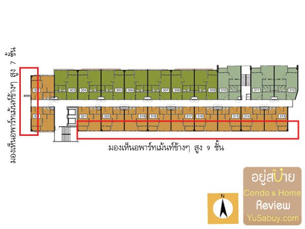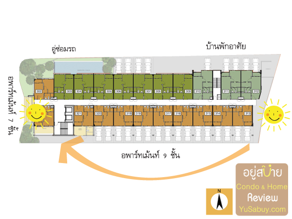 ตัวอาคารนั้นวางตัวตามแนวทิศตะวันออกตะวันตก ผมใส่ตำแหน่งพระอาทิตย์ยิ้มแฉ่งมาในรูปกราฟฟิกแต่ของจริงด้านทิศใต้ก็จะไม่โดนแดดอยู่ดีครับ เพราะมีอพาร์ทเม้นท์ด้านหลังช่วยบังแดดให้เต็มๆ คือทิศใต้ของโครงการนี้ไม่เห็นวิวแต่ก็ได้ร่มเงามาแทนไม่ร้อน