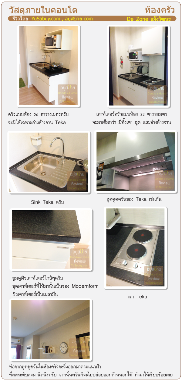 ส่วนแปลนคอนโด De Zone แบบ 32 ตารางเมตรนั้นหน้ากว้างจะเท่าๆกับแบบ 26 ตารางเมตร แต่จะแตกต่างกันที่ความลึกของห้องครับ พื้นที่ความลึกห้องที่เพิ่มขึ้นนั้นทำให้สามารถทำครัวแยกเป็นสัดส่วนออกมาได้เลย โครงการทำประตูบานกระจกกั้นมาให้เรียบร้อย ตรงนี้ใครอยากทำมื้อหนัก ต้ม ผัด แกง ทอด ก็โอเค เพราะอย่างน้อยก็มีประตูกั้นแยกครับ ส่วนควันจากการทำอาหารก็จะมีฮูดดูดควันซึ่งโครงการดร็อบฝ้าเพดานลงมาแล้วเดินท่อซ่อนเอาไว้ให้เรียบร้อย ข้อจำกัดจากการใช้ครัวน่าจะมีเรื่องที่ตำแหน่งห้องซึ่งอยู่ลึกจากด้านนอกมาก ทำให้แสงธรรมชาติเข้ามาไม่ค่อยถึงครับ คงต้องเปิดไฟเอา แต่ก็ไม่ใช่ข้อเสียใหญ่โตอะไร