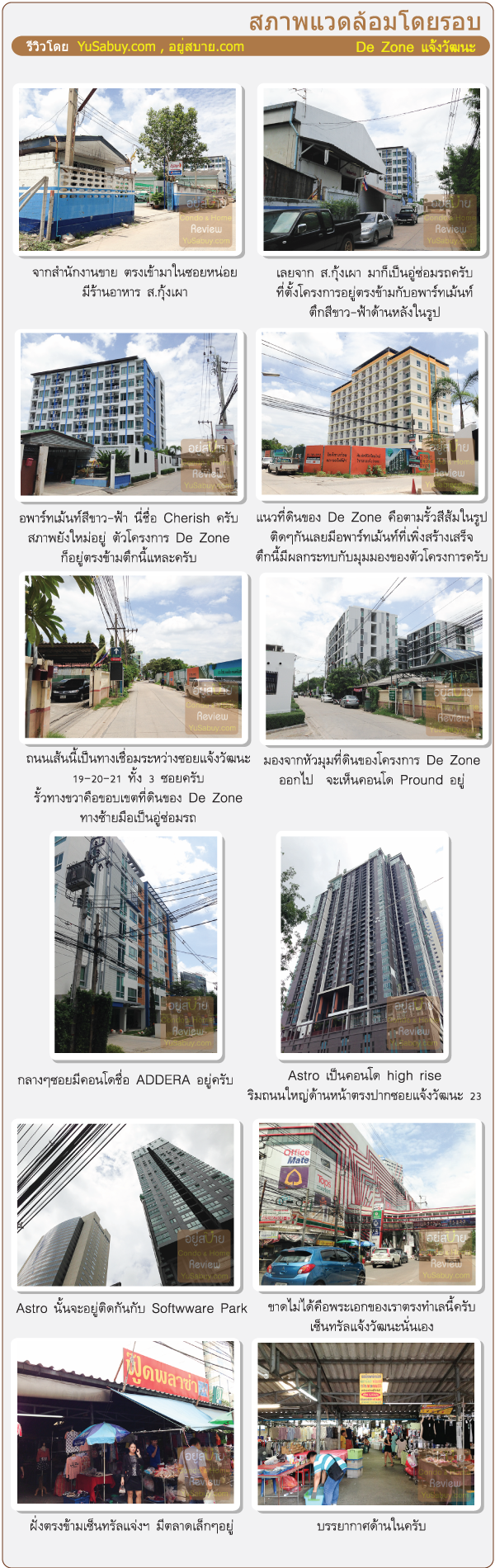 ตรงท้ายซอยบริเวณที่ตั้งคอนโด de Zone นั้นมีอาคาร low rise หลายตึกทีเดียวครับ มีทั้งคอนโดและอพาร์มเม้นท์ ที่ติดๆกับตัวที่ดินเลยก็เป็นอพาร์ทเม้นท์ที่เพิ่งสร้างเสร็จใหม่ๆเลย (หมายเลข 2) ฝั่งตรงข้ามเป็นอพาร์ทเม้นท์ที่เปิดมาได้พอสมควรแล้วชื่อ Cherish ครับ สภาพนั้นยังดูดีมากทีเดียวไม่ได้โทรมครับ ด้านในตรงซอยเชื่อมระหว่างแจ้งวัฒนะ 21 กับ 23 เป็นคอนโดชื่อ Proud โครงแรก ถ้าขยับไปในซอยแจ้งวัฒนะ 19 จะมีโครงการ 2 ชื่อ Proud x2