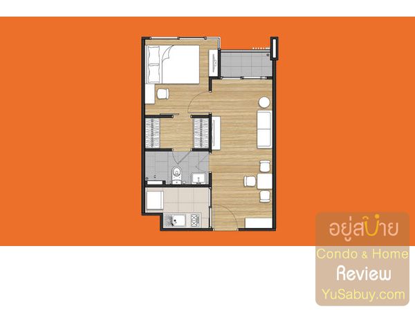 เริ่มจากแปลนแบบ 26 ตารางเมตรกันก่อนครับ เข้าห้องมาจะมีเคาท์เตอร์ pantry ครัวอยู่ด้านหน้าห้อง ส่วนรับประทานอาหารกับพักผ่อนอยู่ต่อเนื่องกันแบบแปลนคอนโด 1 ห้องนอนทั่วๆไป จุดที่แตกต่างจากแปลนไซส์นี้ทั่วๆไปคือตรงทางเข้าห้องน้ำกับห้องนอนมีสเปซเล็กๆเป็น Foyer ทำให้ดูพื้นที่ใช้งานนั้นเป็นสัดเป็นส่วนดีครับ