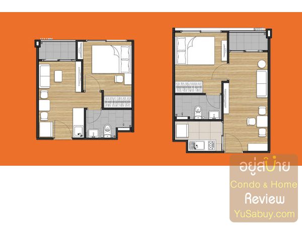 แปลนห้องคอนโด de Zone แจ้งวัฒนะ แบบ 1 ห้องนอน ขนาด 26 ตารางเมตร(ซ้าย) และ 32 ตารางเมตร(ขวา)