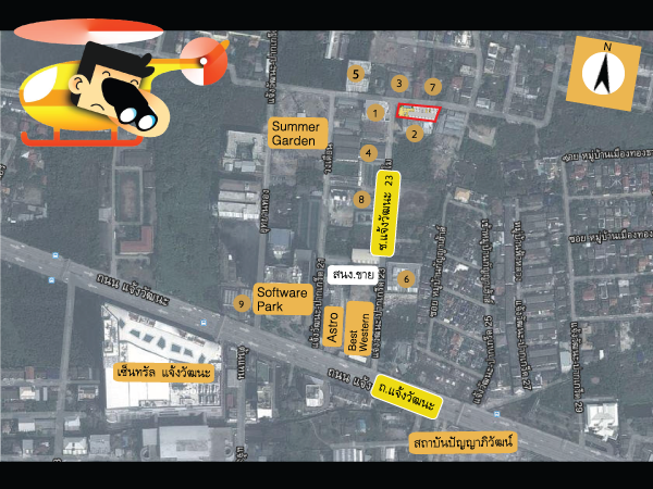 ดูบริเวณรอบๆไปแล้วก็มาโฟกัสเข้าไปในซอยแจ้งวัฒนะ 23 กันว่ามีอะไรบ้างครับ ถัดจากตรงปากซอยที่เป็นคอนโด Astro แล้วก็จะเป็นสำนักงานขายของ de Zone ครับ ฝั่งตรงข้ามสำนักงานขายนั้นเป็นคอนโด low rise ที่สร้างเสร็จไปแล้วชื่อ Addera (หมายเลข 6) เข้าไปในซอยอีกจะเจอร้านอาหาร ส.กุ้งเผา (หมายเลข 8) ติดๆกันกับ ส.กุ้งเผาก็จะเป็นอู่ซ่อมรถ (หมายเลข 4)