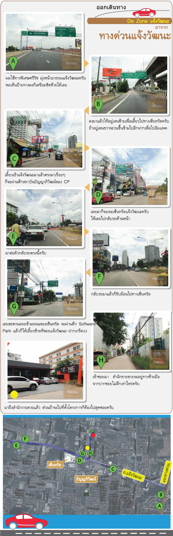 วันนี้ผมเริ่มเดินทางโดยใช้ทางด่วนศรีรัชมุ่งหน้ามาลงแจ้งวัฒนะครับ พอลงทางด่วนเสร็จให้เลี้ยวซ้ายไปทางเซ็นทรัลแจ้งวัฒนะ (ถ้าอยู่เลนขวาจะวนขึ้นสะพานไปทางอิมแพค อารีน่า) พอเลี้ยวซ้ายเข้าแจ้งวัฒนะได้แล้ว ก็ให้ตรงไปเรื่อยๆ เราจะผ่านสถาบันปัญญาภิวัฒน์ของทางเครือ CP พอตรงไปอีกนิดก็จะถึงเซ็นทรัลแจ้งวัฒนะ ให้เราตรงเลยไปกลับรถมาอีกฝั่งนึงแล้วขับย้อนกลับมาถึงหน้าเซ็นทรัลฯครับ จากนั้นเราจะผ่านตึก Software Park และคอนโด Astro เป็นคอนโด high rise ที่กำลังสร้างอยู่ตรงปากซอยแจ้งวัฒนะ-ปากเกร็ด 23 จากนั้นให้เราเลี้ยวซ้ายเข้าซอยนี้เลย สำนักงานขายจะอยู่ด้านหลังคอนโด Astro ตรงกลางๆซอย ส่วนที่ดินของโครงการจะอยู่ท้ายซอยครับ